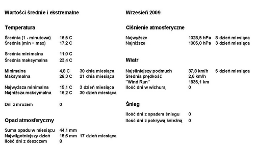 Poniżej prezentujemy wartości średnie i ekstremalne we wrześniu 2009 roku. Kliknij by powiększyć.